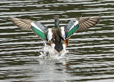 In a sudden burst the Shoveler lifted off to get further away from my camera lens, I think. I was lucky to get a full and clear shot of its spread wings to show its full coloring. The male of the species is much more colorful than the female.