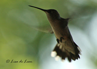 This bird flits everywhere, forwards and backwards. It can beat its wings up to 75 times a second. Think about this. It can hover in one spot for quite some time. The naked eye can't capture an image of the wings when in full motion, a camera lens at the right settings has a better chance. In this image the wings just become a blur.